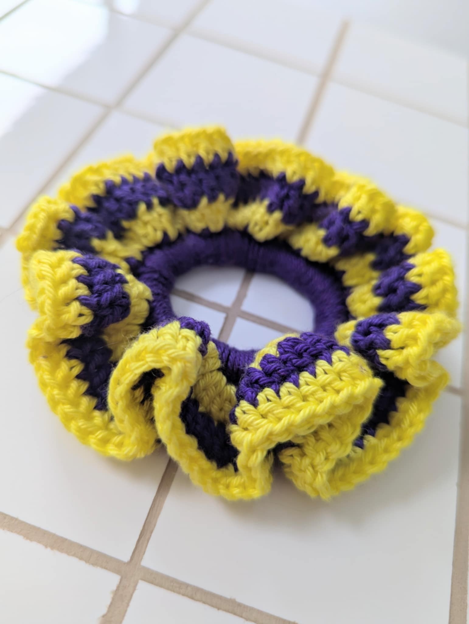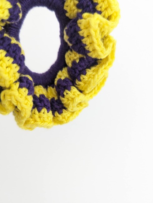 100% coton, crocheté à la main, jaune et violet