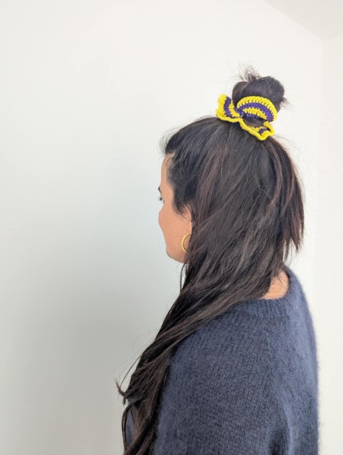 Aussi joli autour du poignet que dans les cheveux, ce chouchou est crocheté autour d'un élastique