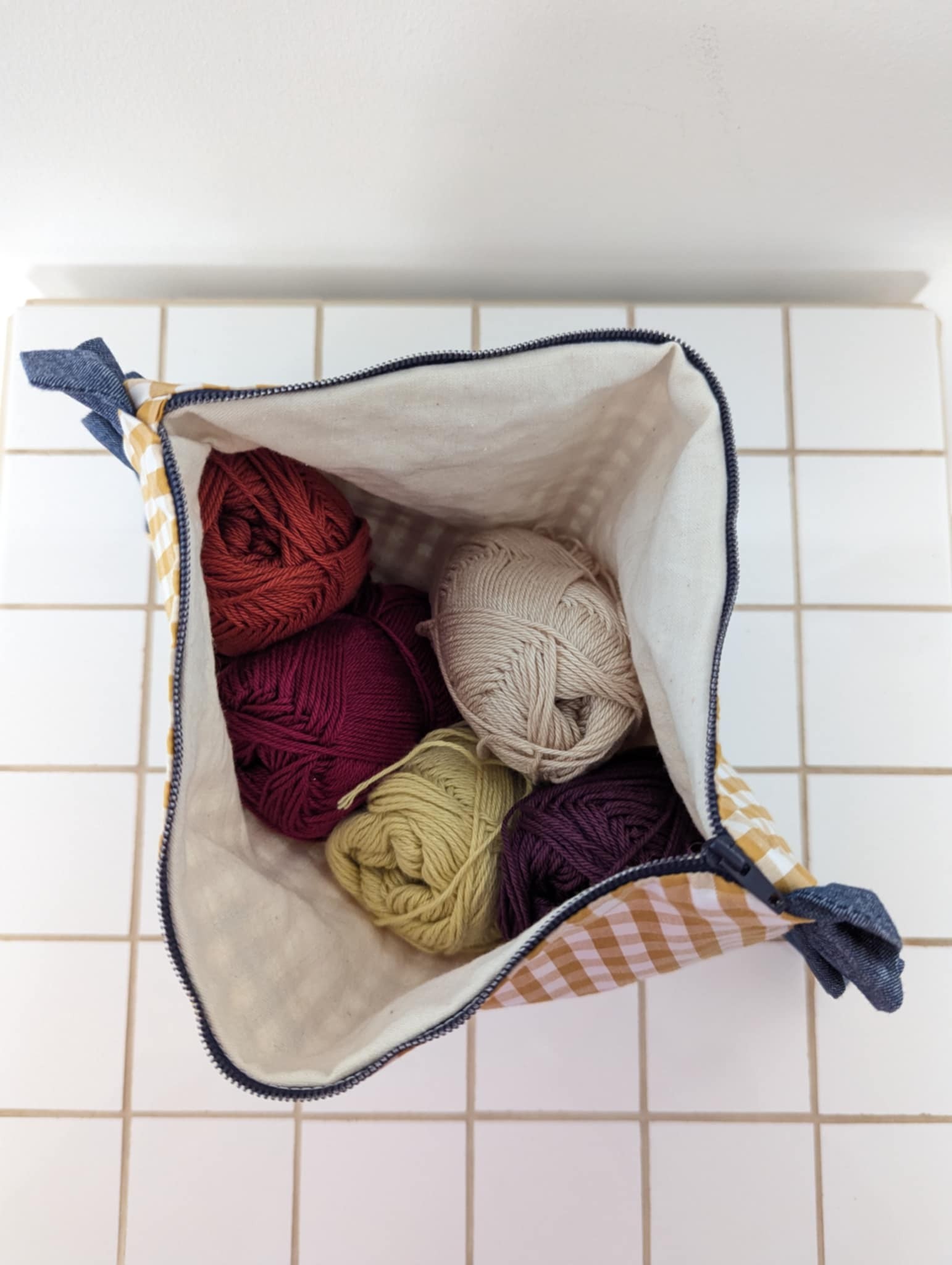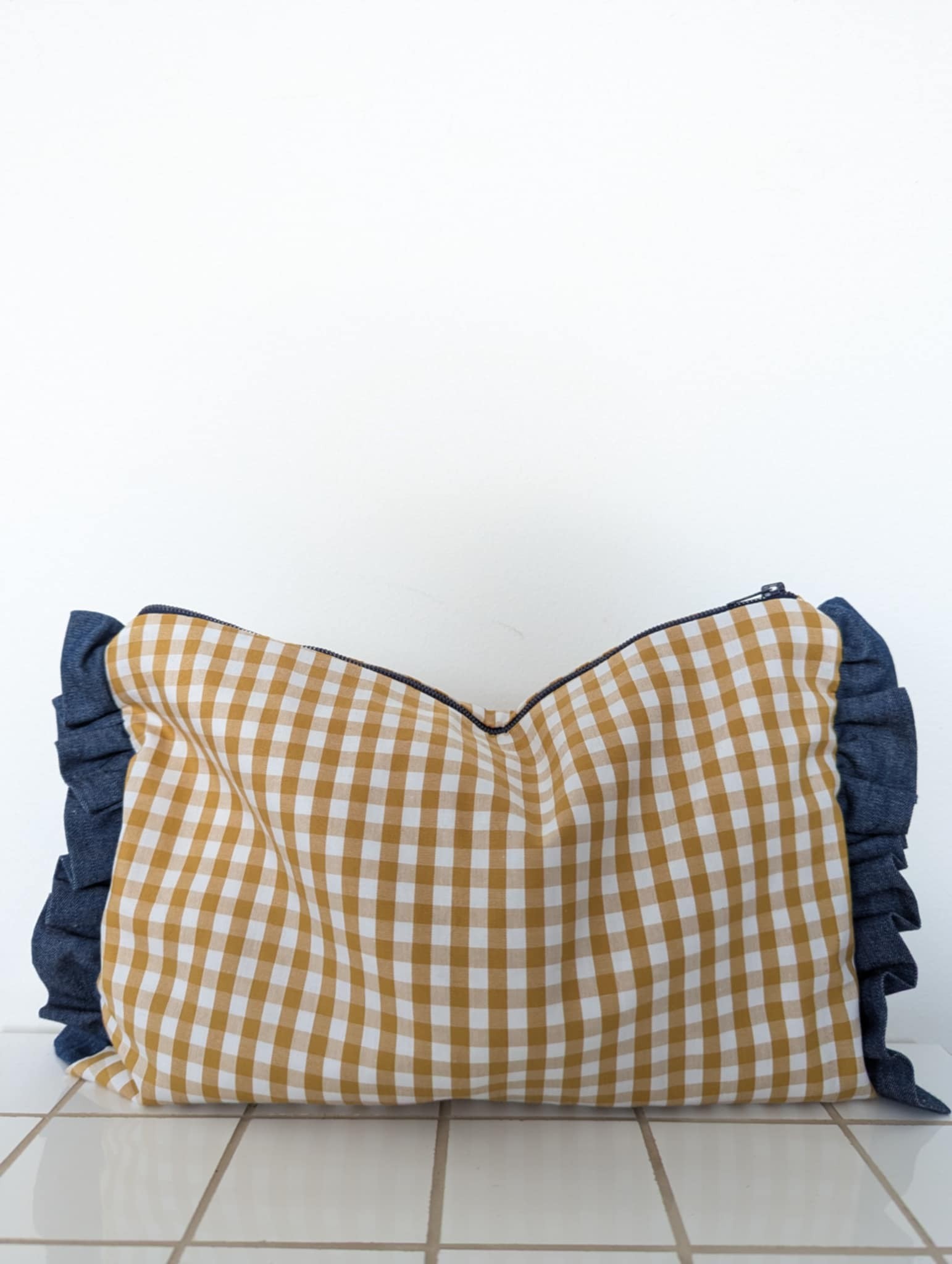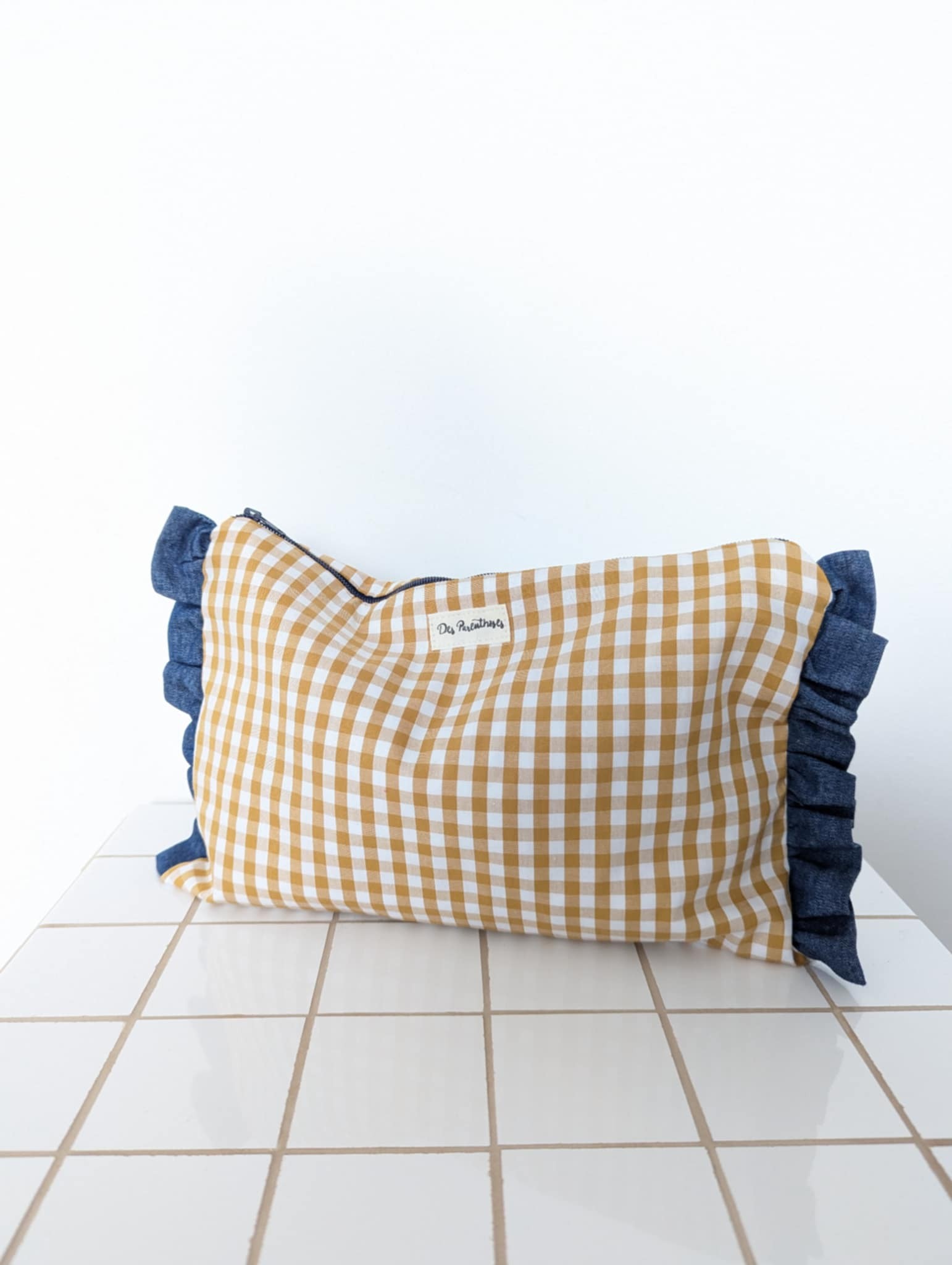 Pochette en tissus 100% coton jaune moutarde et blanc, petits volants en tissus jean bleu et fermeture éclair bleu marine