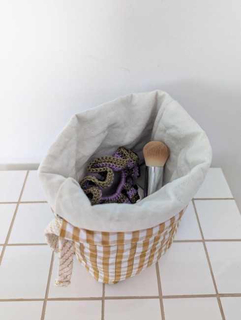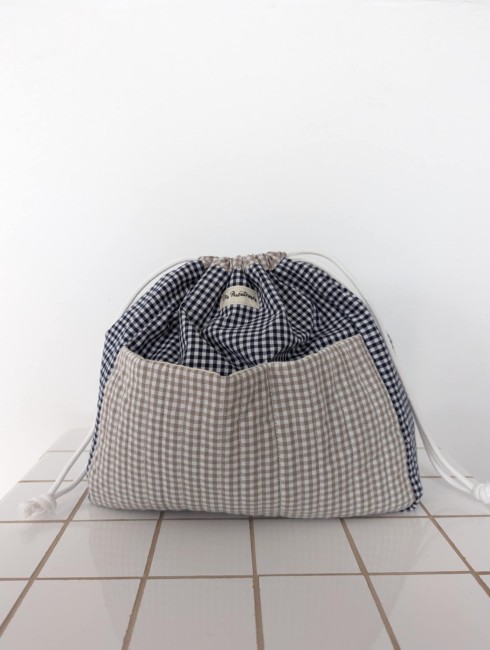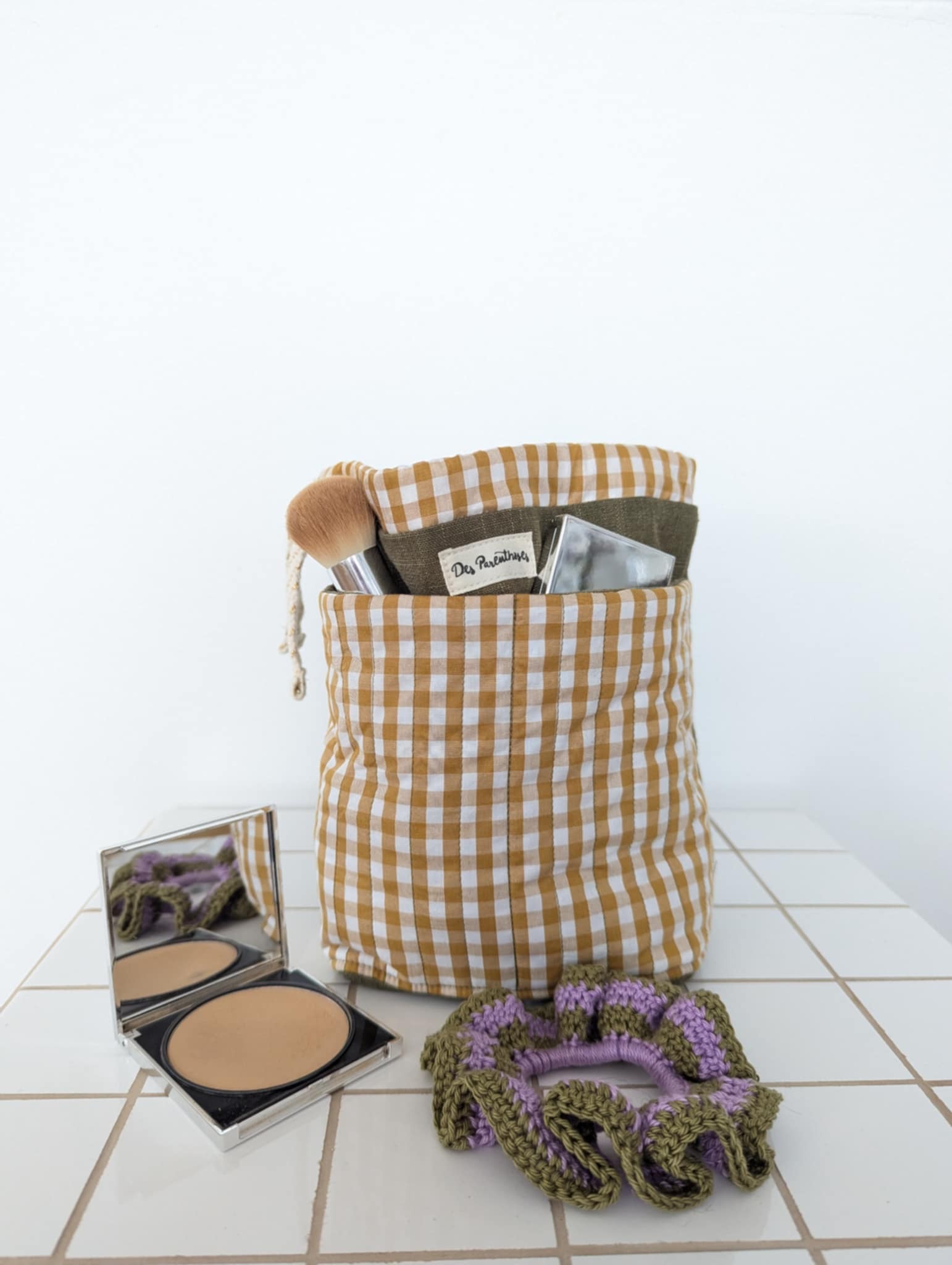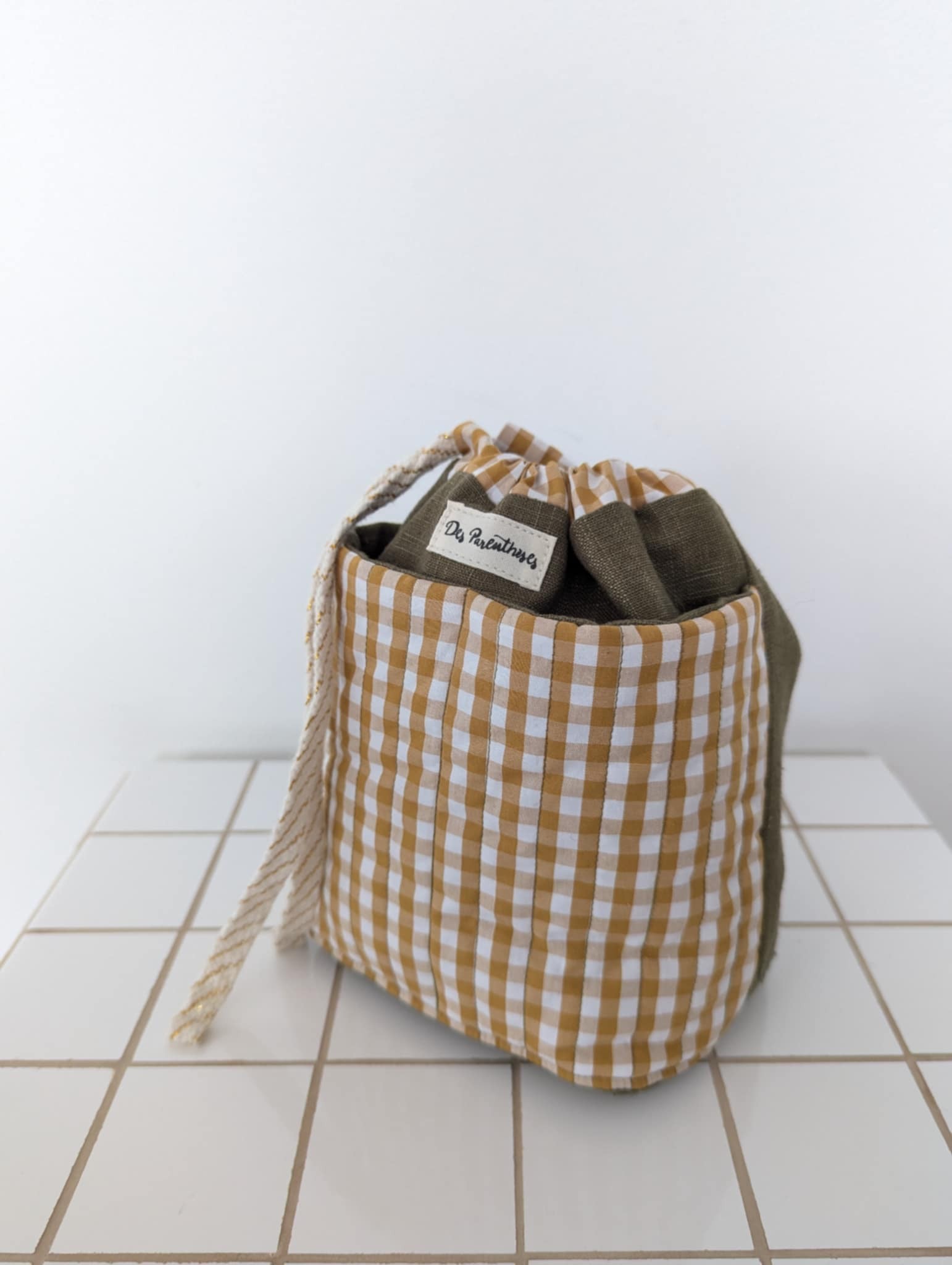 Pochon en tissus 100% lin pour le tissu kaki et 100% coton pour le tissu vichy moutarde et blanc
