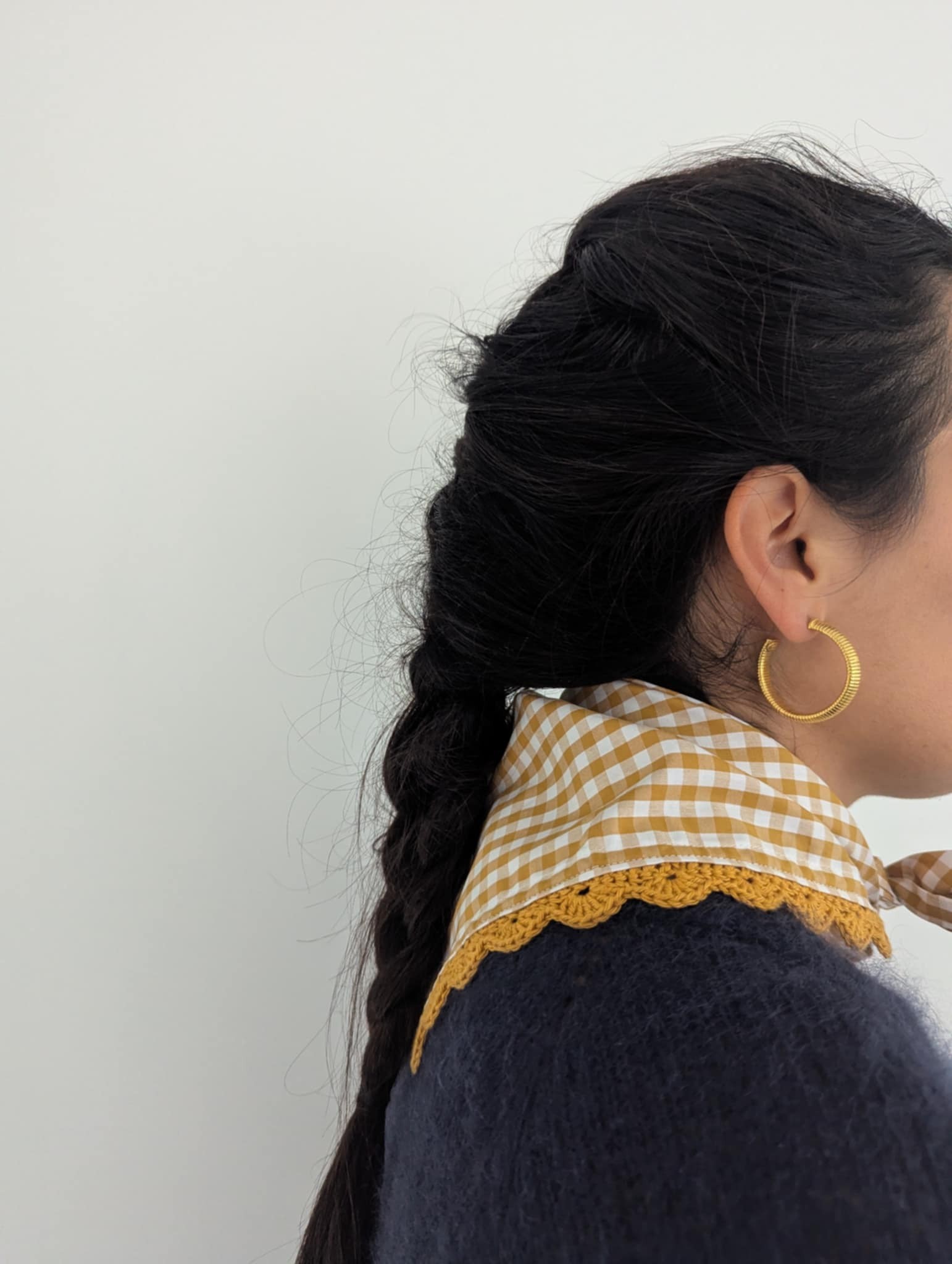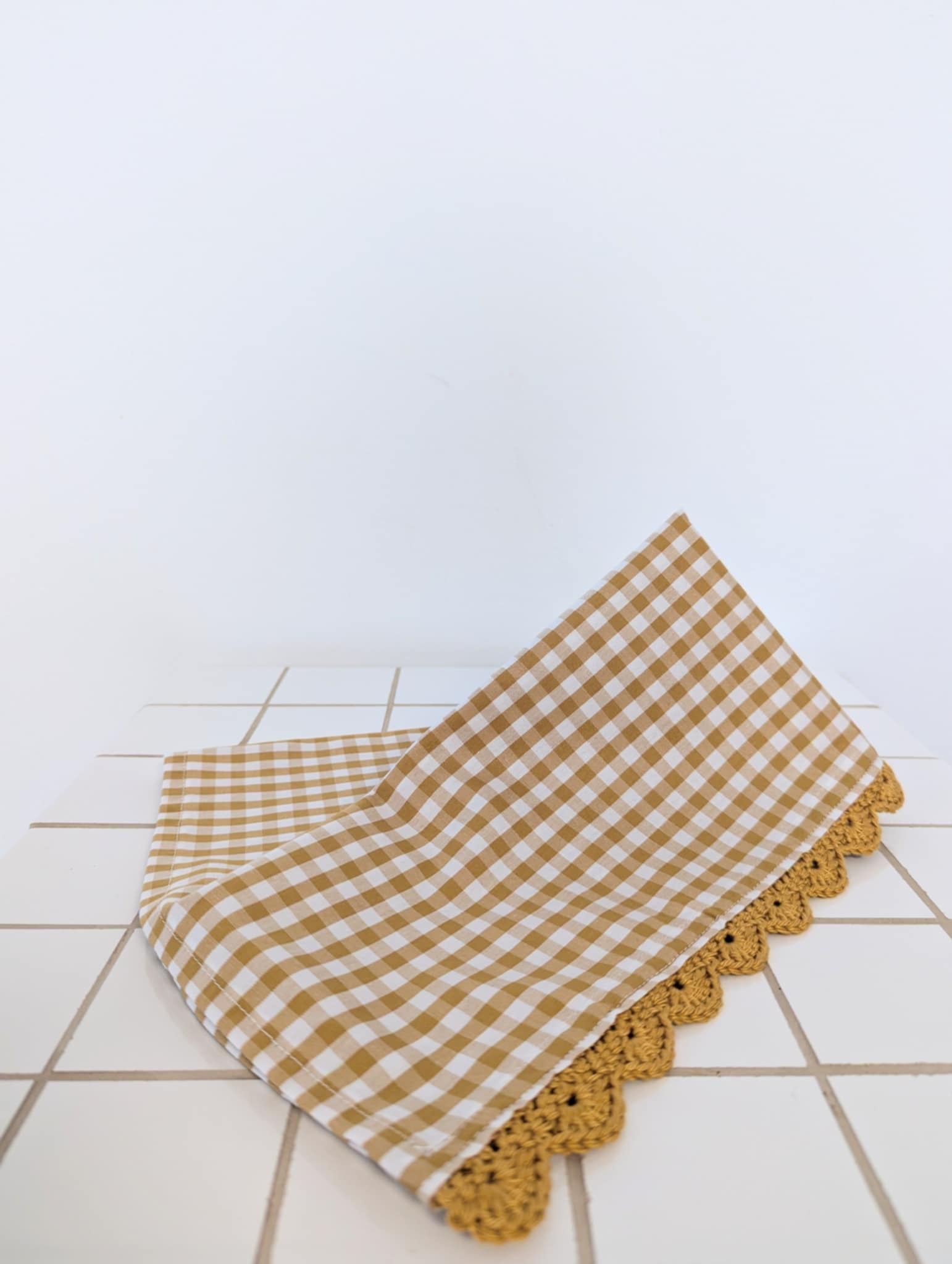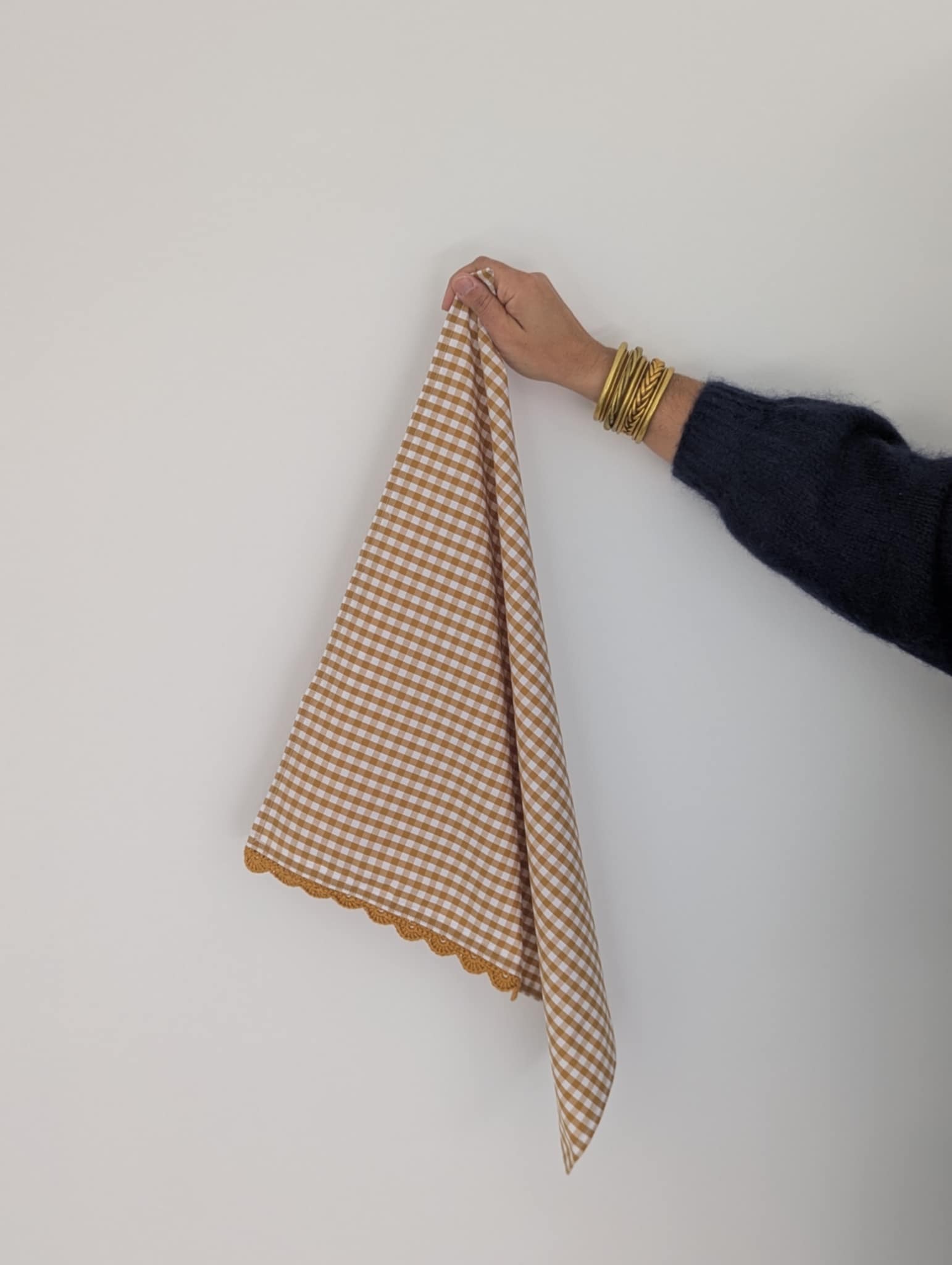 Bandana en coton vichy ocre et blanc et volant crocheté en coton