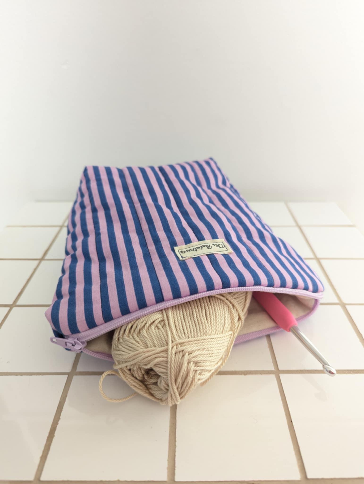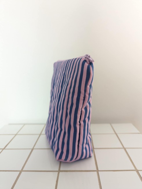 Pochette en tissus 100% coton rayé rose/mauve et bleu, matelassé et fermeture éclair mauve