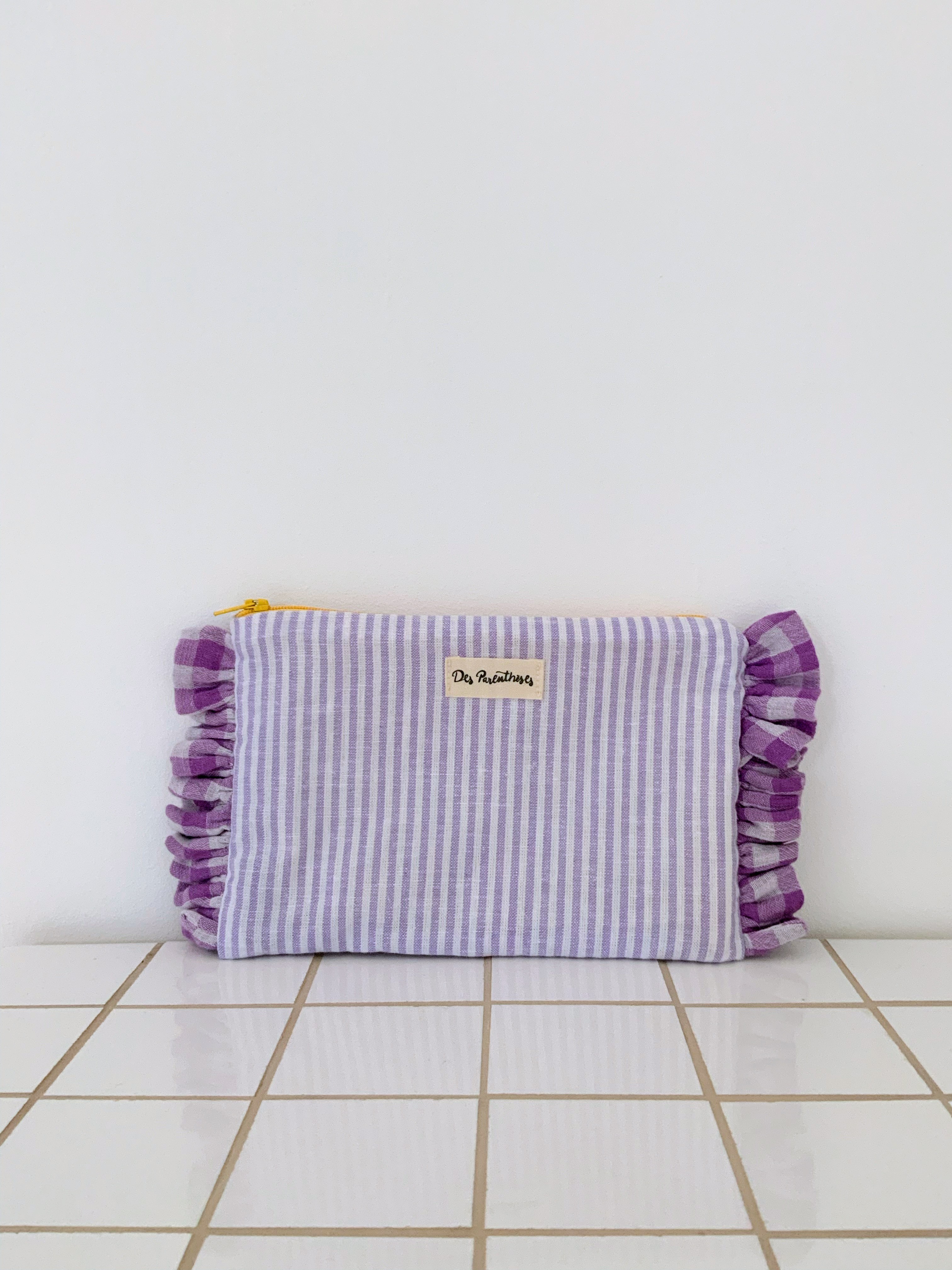 Pochette en tissus 100% coton rayé lilas et blanc, petits volants en tissus gaze de coton à carreaux et fermeture éclair jaune