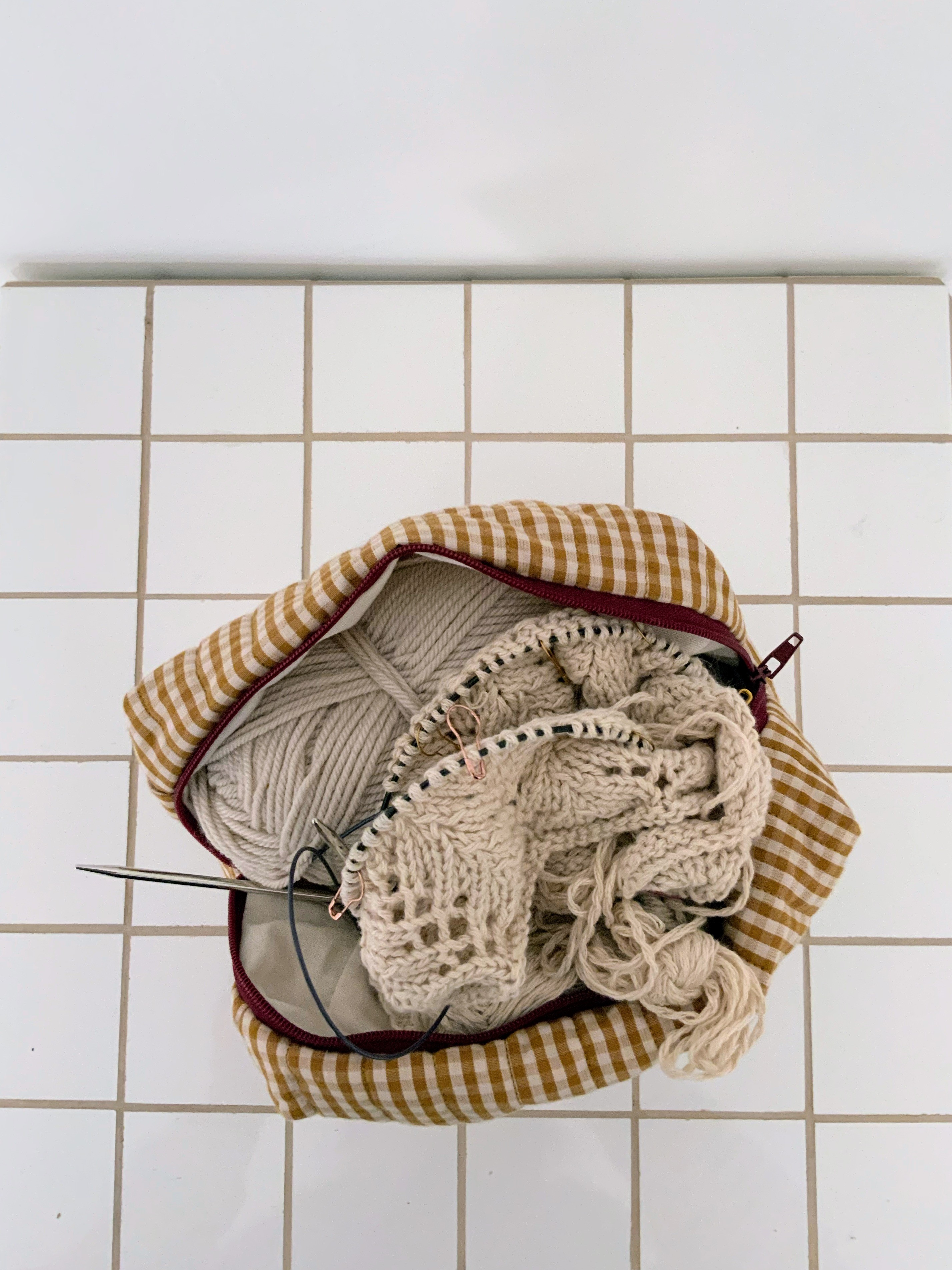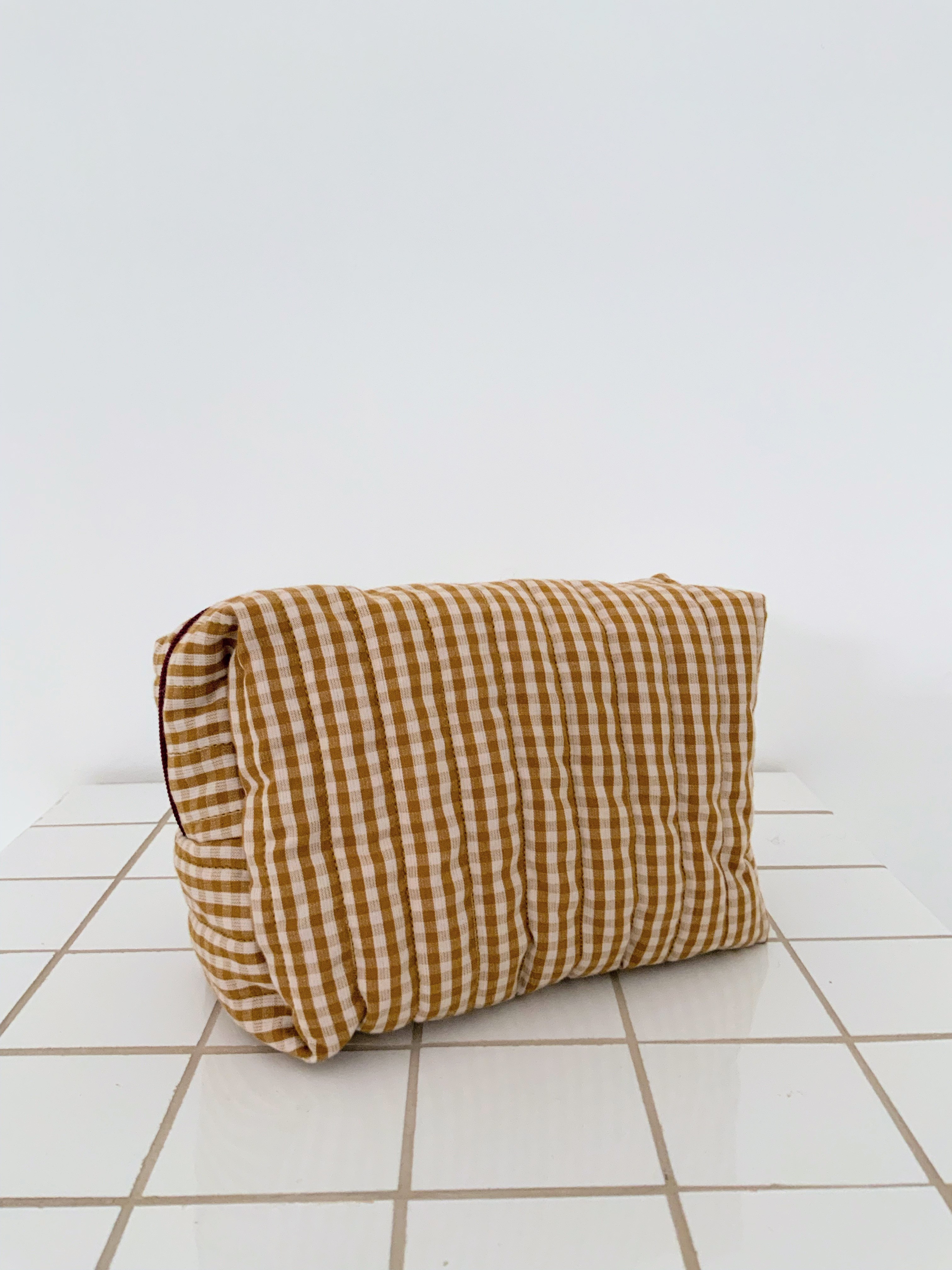 Pochette en tissus 100% coton vichy ocre et blanc, matelassée, petits volants en tissus coton chambray et fermeture éclair bordeau