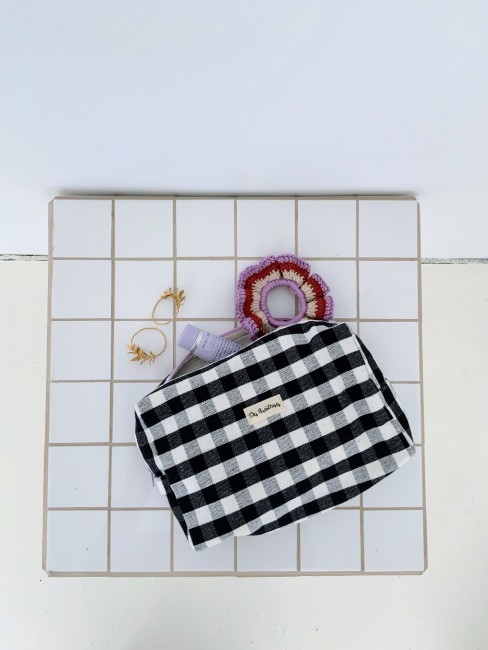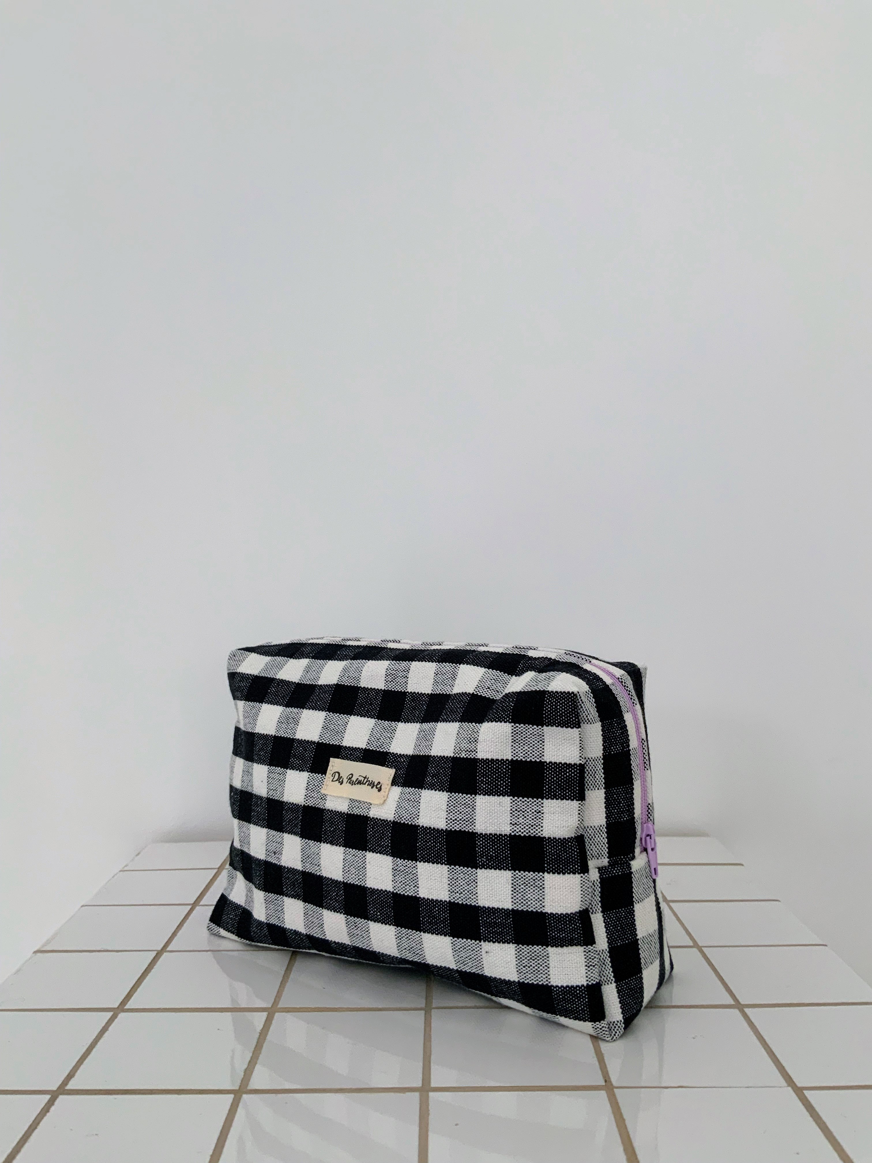Pochette en tissus 100% coton épais à carreaux noir et blanc, fermeture éclair mauve