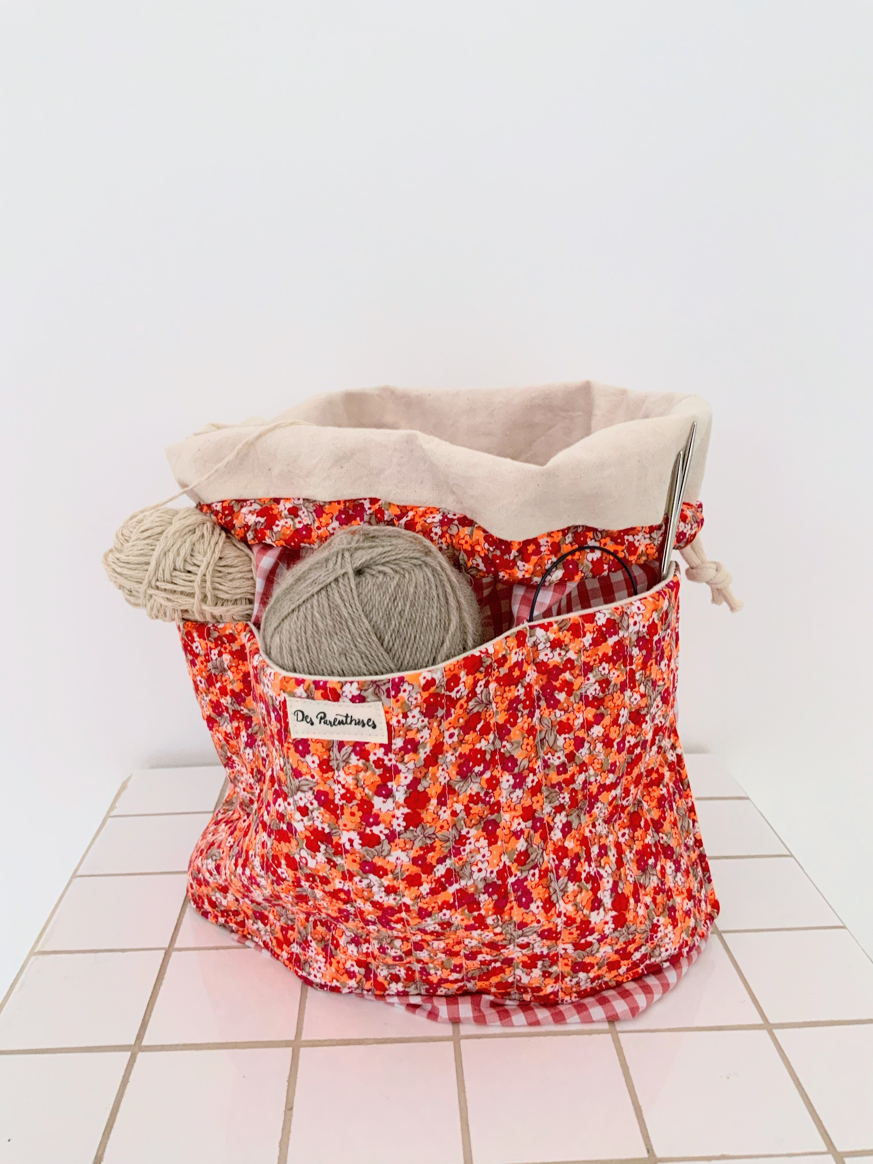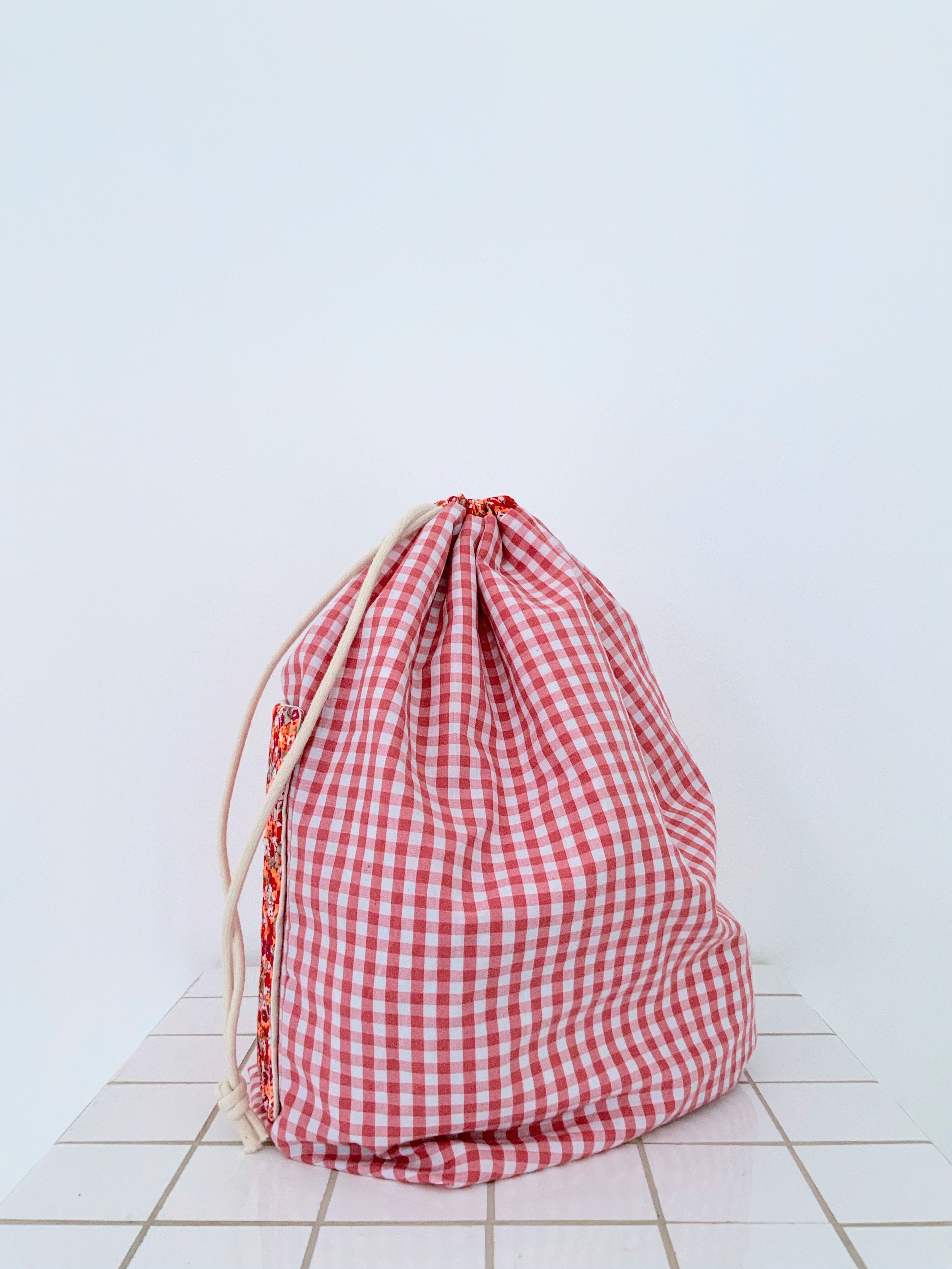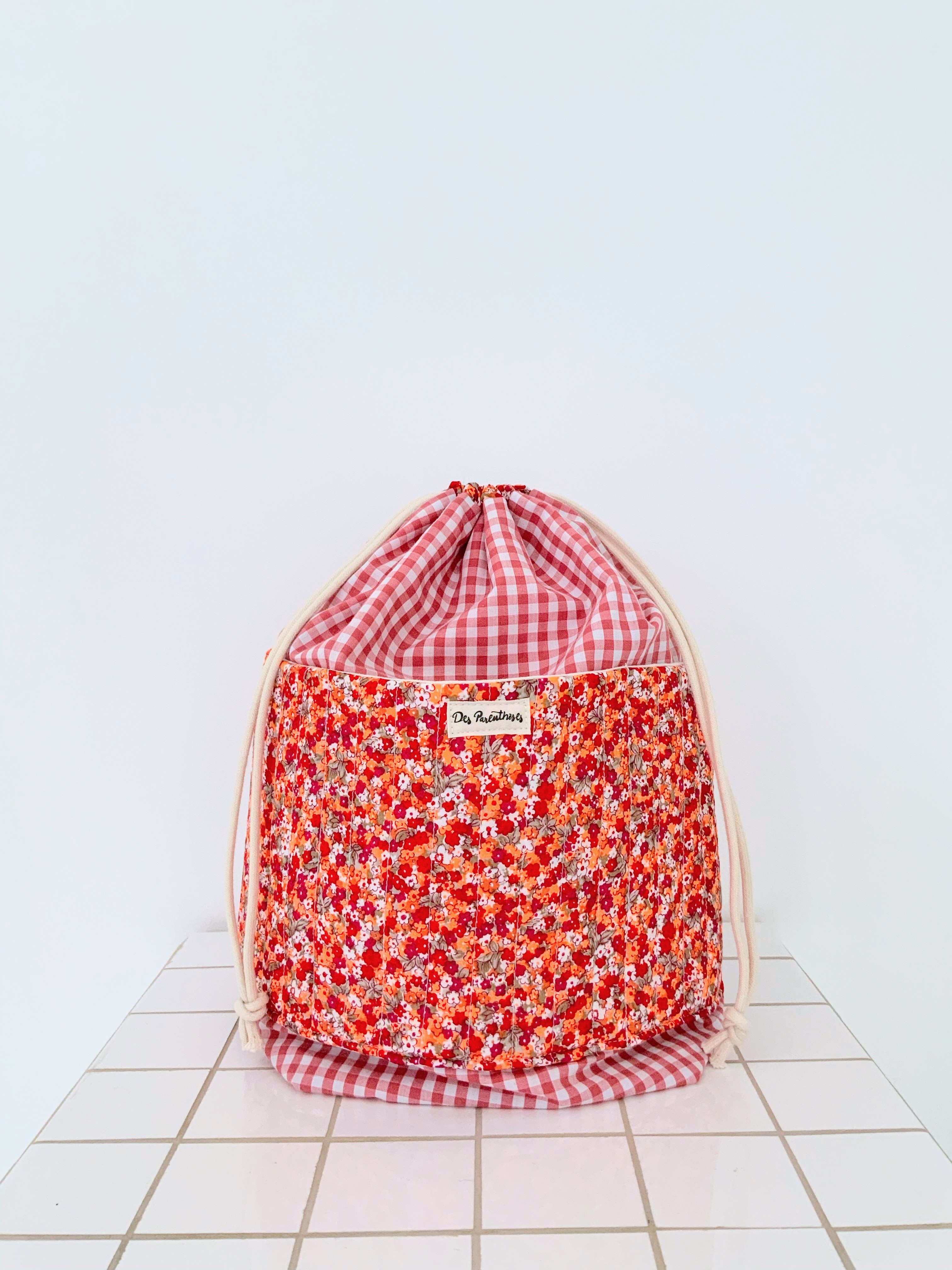 Sac pochon en tissu 100% coton vichy rouge/orange, tissu upcyclé et tissu fleuri rose, rouge, orange fluo, beige