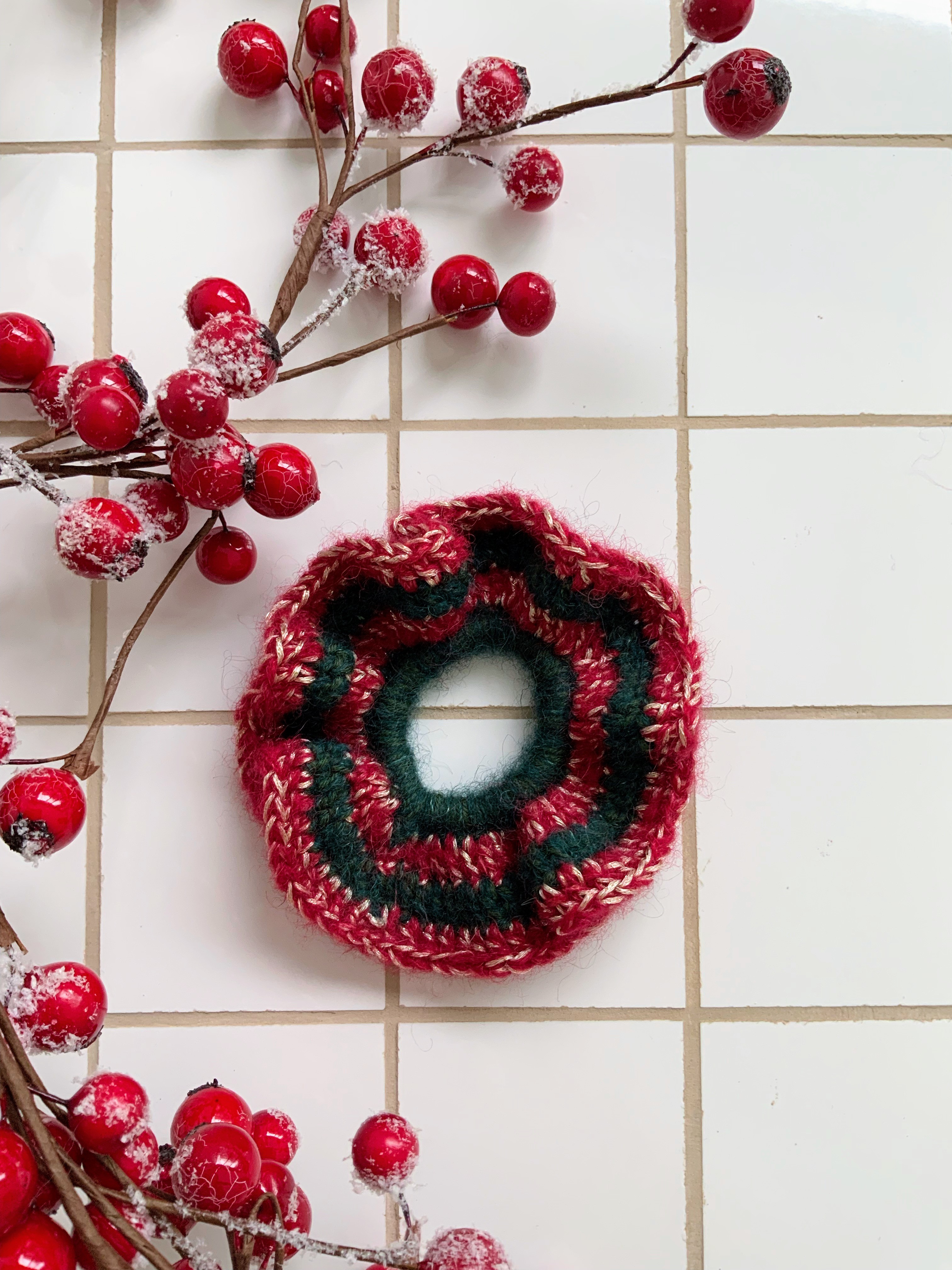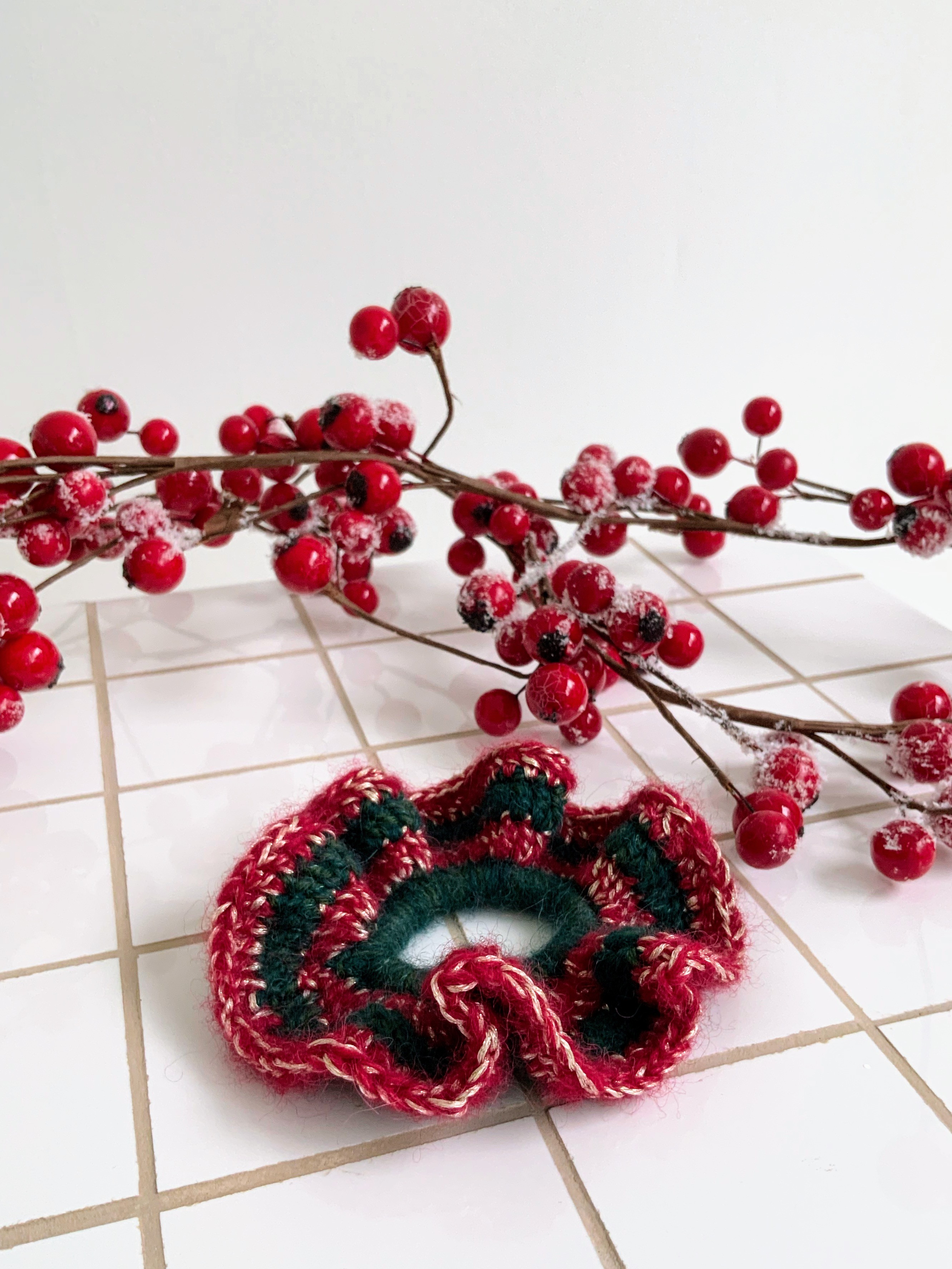 Coton + un fil de lurex doré et mohair, crocheté à la main, rouge et vert
