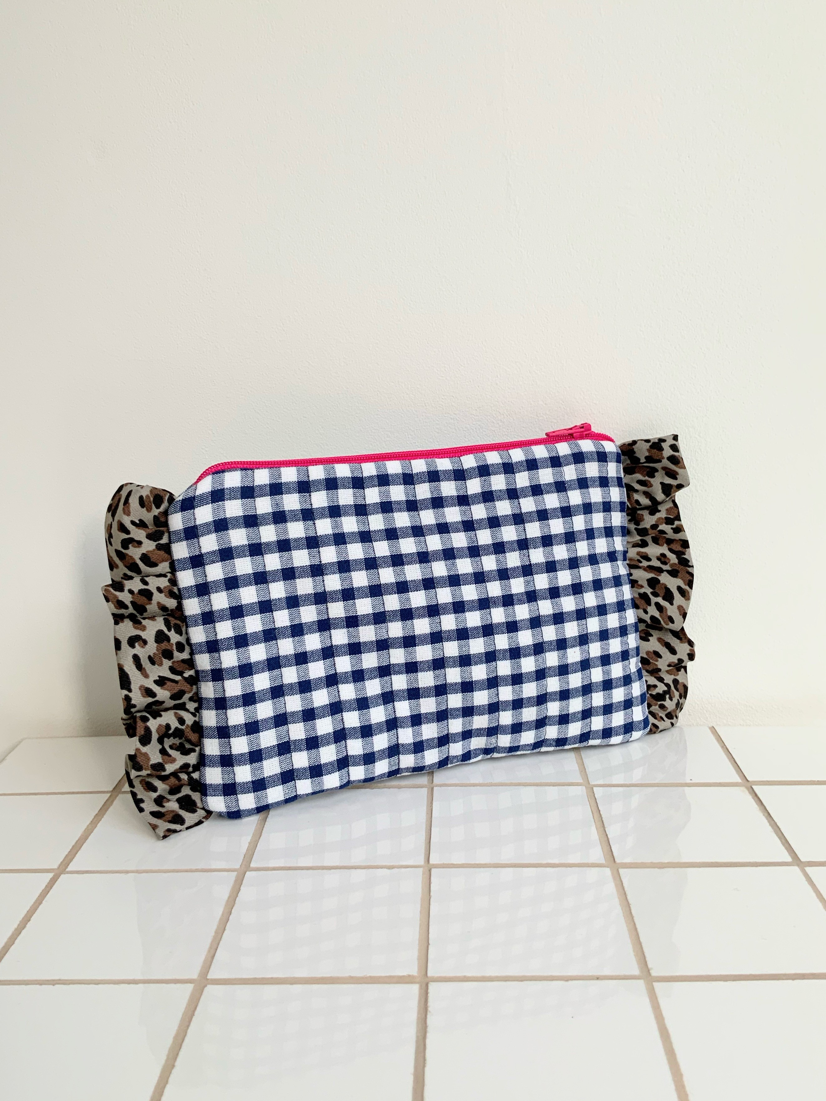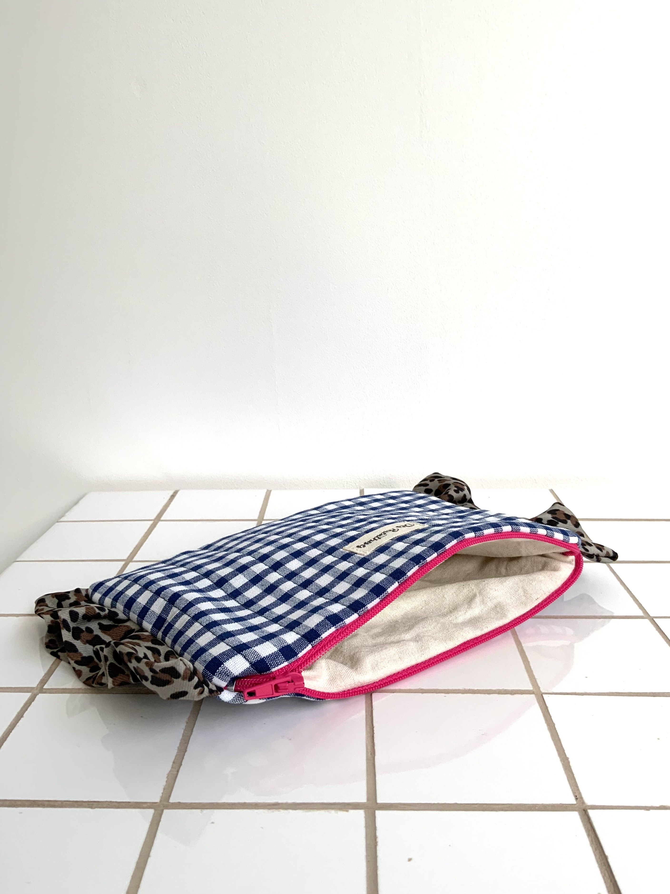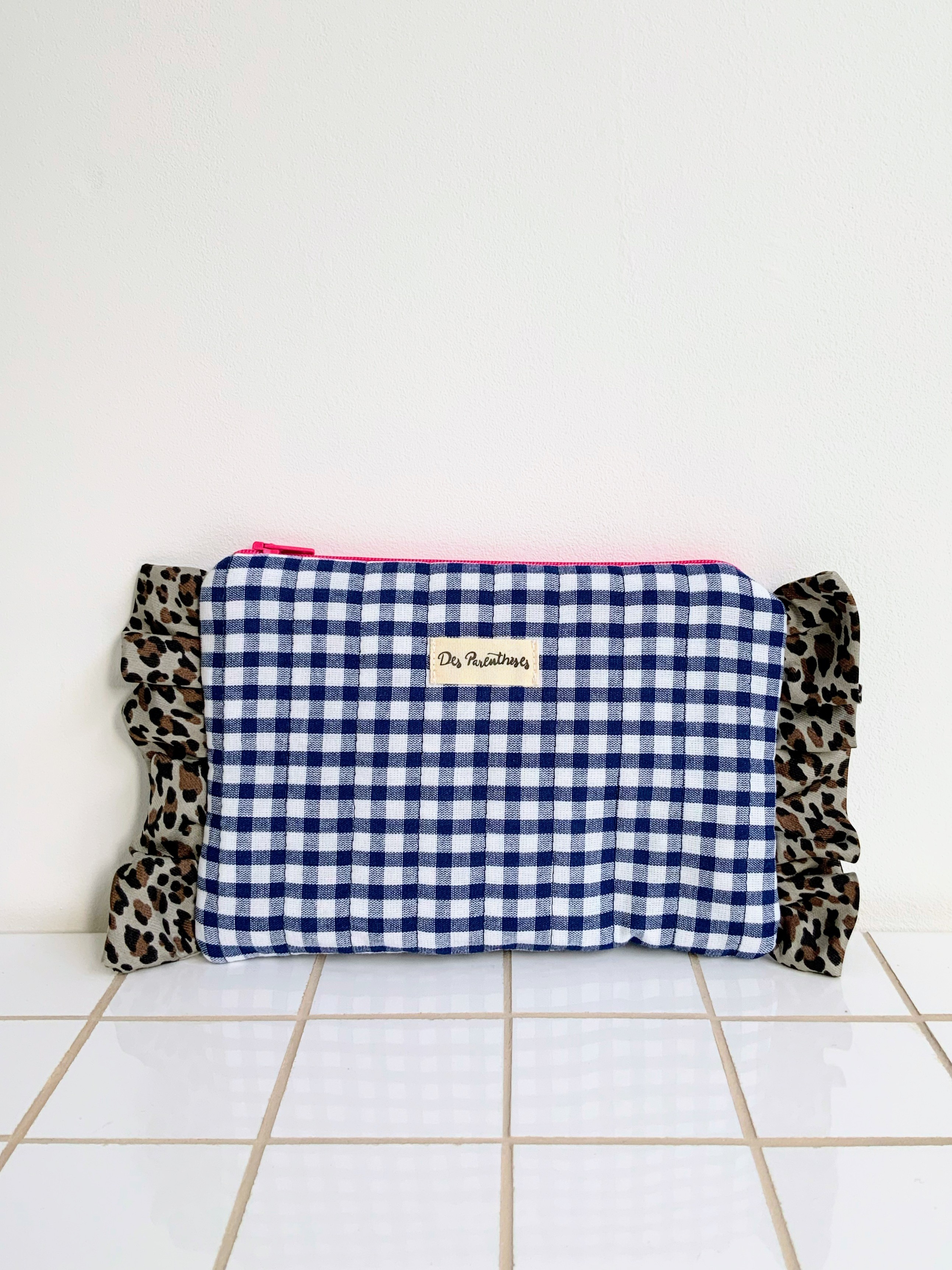 Pochette en tissus 100% coton vichy marine et blanc, matelassée, petits volants en tissus léopard twill de viscose et fermeture rose fushia